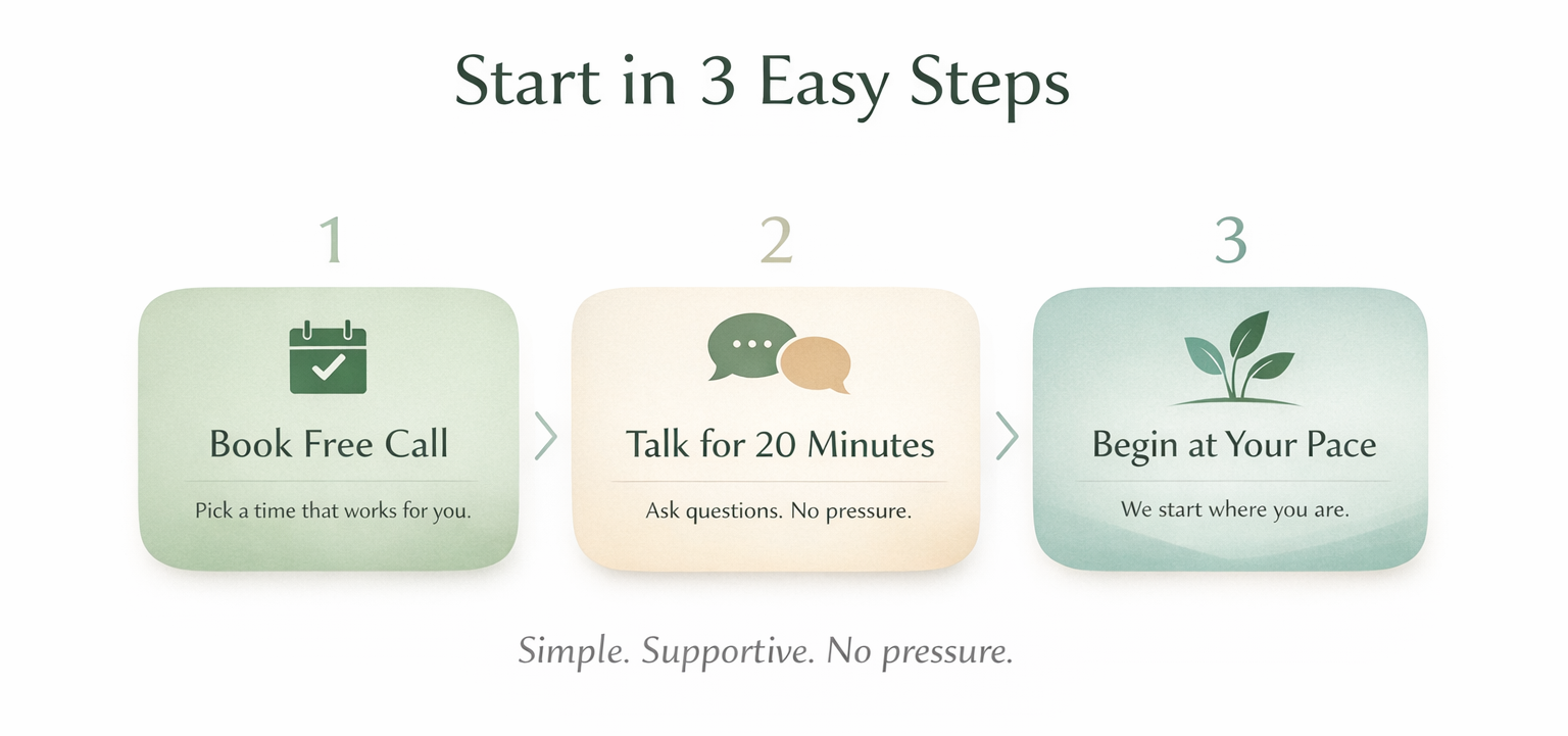 You can start by reaching out through my contact form. I’ll follow up to schedule a free 20-minute phone consultation where we can talk about what’s bringing you in, what you’re hoping for, and any questions you have. If it feels like a good fit, we’ll schedule your first session and go from there.